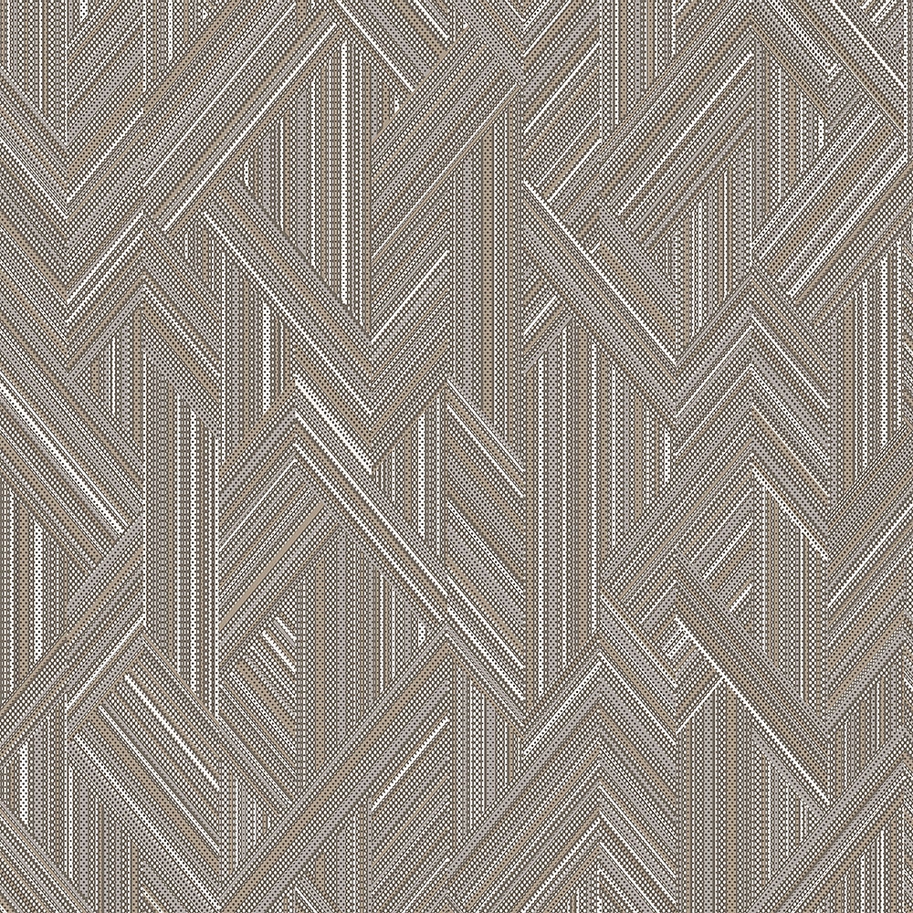 Vliesová, geometrická tapeta s vinylovým povrchem, tlumené odstíny hnědé, šedo-béžové a pololesklé zlaté.