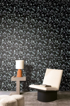 Vliesová tapeta na zeďčerný podklad s květinovým vzorem v odstínech zeleno-modré a fialové, jemná textura.