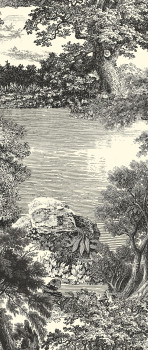 Vliesová obrazová tapeta na zeď, jemně plastická látková textura, romantická krajina v odstínech šedé a černé.
