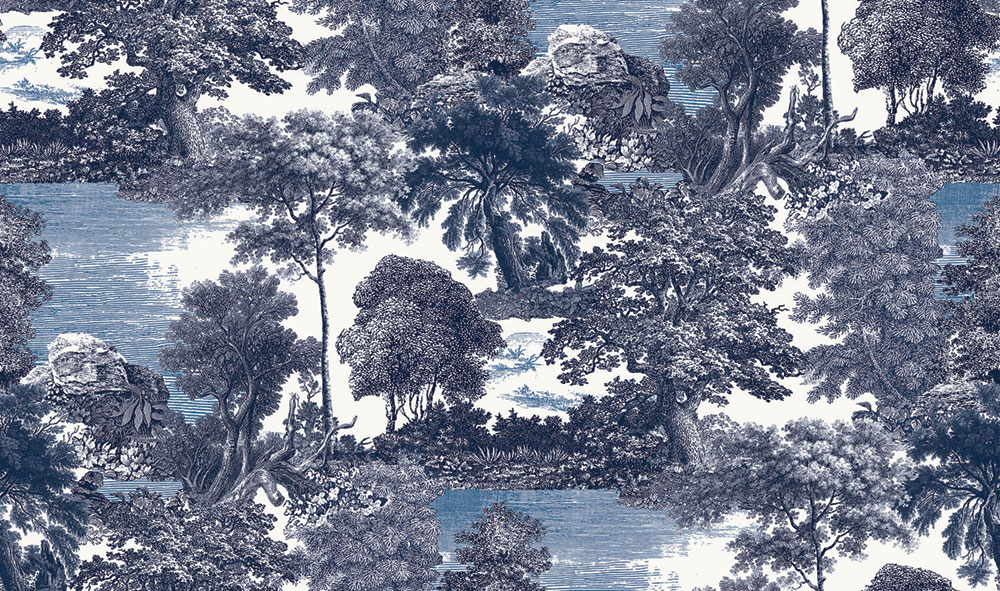 Vliesová obrazová tapeta na zeď, jemně plastická látková textura, romantická krajina v odstínech modré.