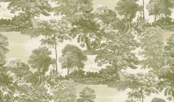 Vliesová obrazová tapeta na zeď, jemně plastická látková textura, romantická krajina v odstínech zelené.