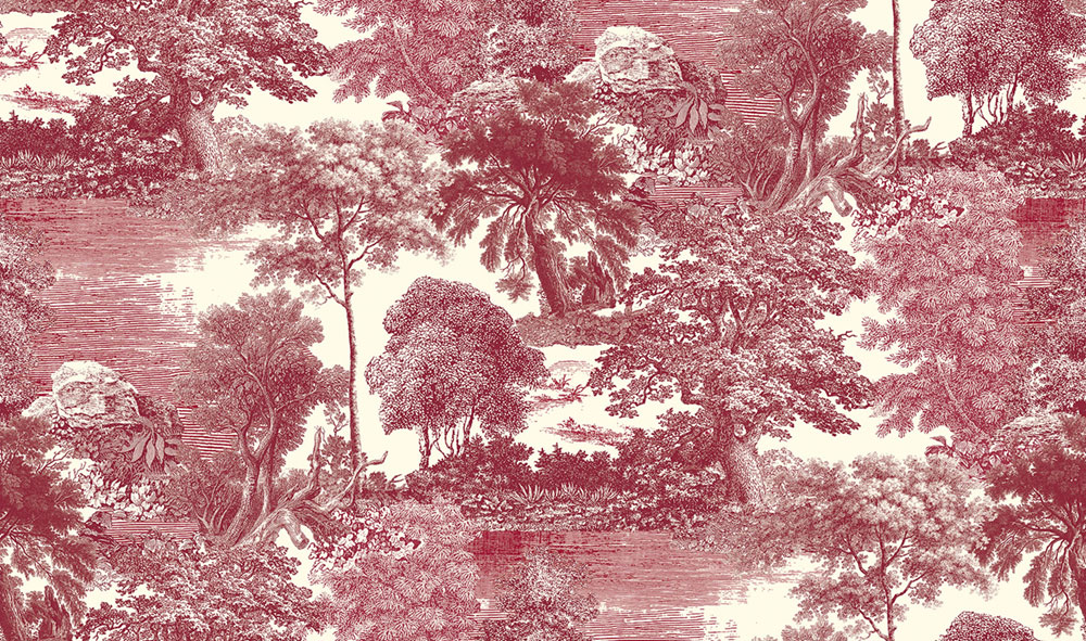 Vliesová obrazová tapeta na zeď, jemně plastická látková textura, romantická krajina v odstínech vínově červené.