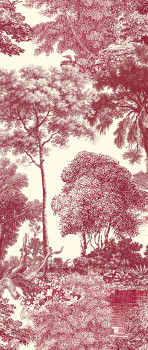 Vliesová obrazová tapeta na zeď, jemně plastická látková textura, romantická krajina v odstínech vínově červené.