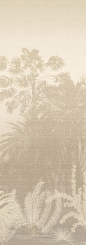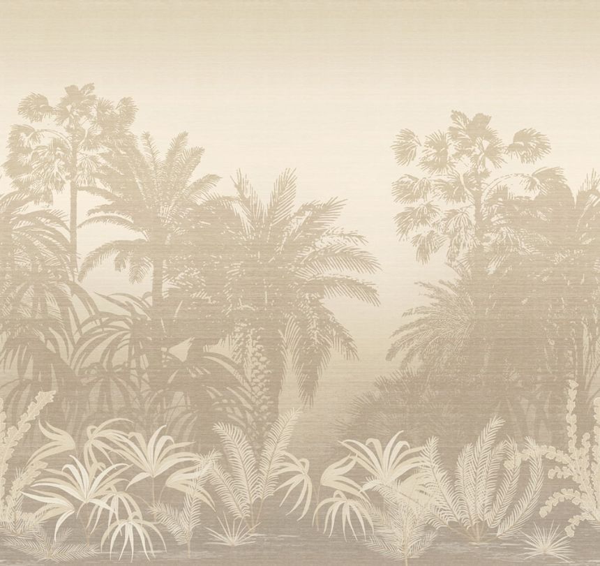 Vliesová obrazová tapeta na zeď, jemně plastická látková textura, motiv tropické krajiny, palem v odstínech šedé a béžové / pískové.