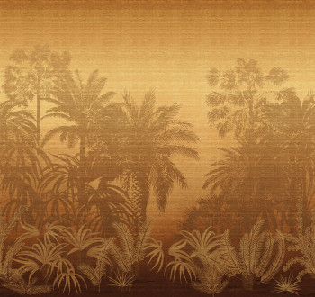 Vliesová obrazová tapeta na zeď, jemně plastická látková textura, motiv tropické krajiny, palem v odstínech hnědé a okrové.