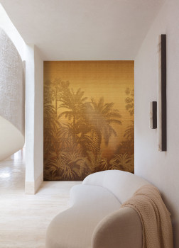 Vliesová obrazová tapeta na zeď, jemně plastická látková textura, motiv tropické krajiny, palem v odstínech hnědé a okrové.