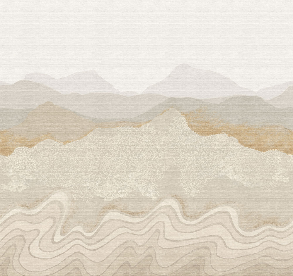 Vliesová obrazová tapeta na zeď, jemně plastická látková textura, motiv horské krajiny v odstínech šedé a béžové.