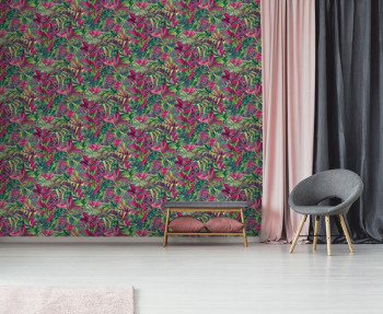 Vliesová, vícebarevná tapeta s květy, exotickými palmami a listy.