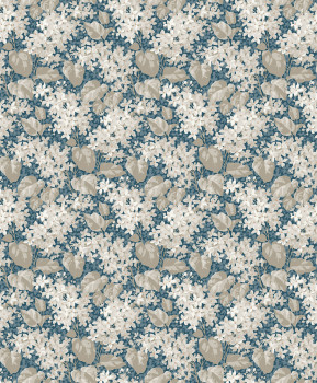 Vliesová tapeta na zeď, podklad modrý, vzor rozkvetlých šeříků v odstínech šedo-béžové.