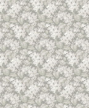 Vliesová tapeta na zeď, podklad šedý, vzor rozkvetlých šeříků v odstínech šedo-béžové.