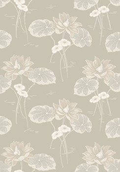 Vliesová tapeta na zeď, podklad šedý, vzor leknínů v odstínech šedo-béžové.
