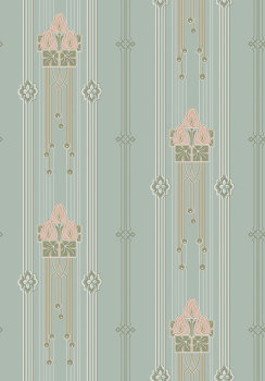 Vliesová tapeta na zeď, podklad tyrkysový, secesní vzor s květinovými medailony, bílými, zelenými a zlatými liniemi.