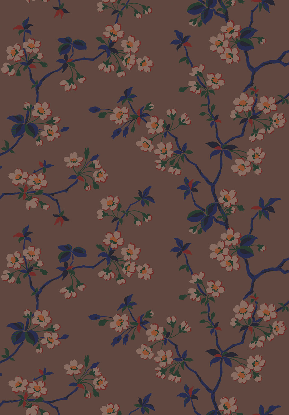 Vliesová tapeta na zeď, podklad tmavý hnědý, vzor rozkvetlých třešňových větviček v odstínech modré, zelené, červené a béžové.