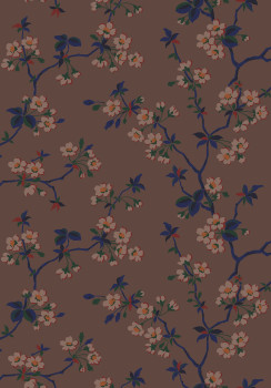 Vliesová tapeta na zeď, podklad modrý, vzor rozkvetlých třešňových větviček v odstínech zelené, modré, oranžové a šedo-béžové.