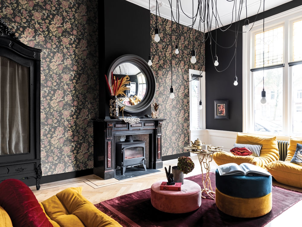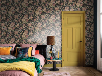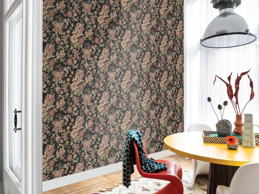 Vliesová tapeta s vinylovým povrchem. Květinový vzor na černém podkladu.