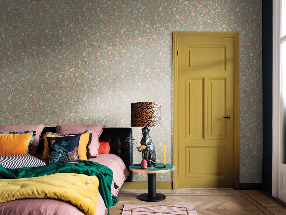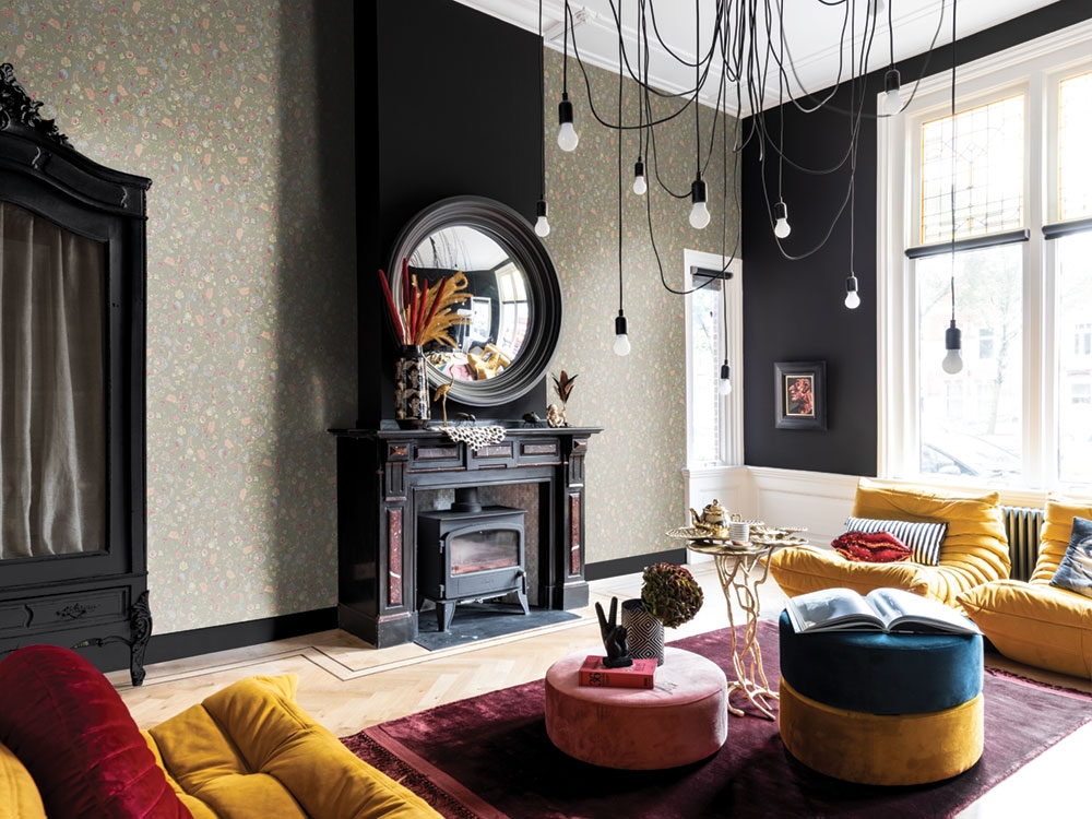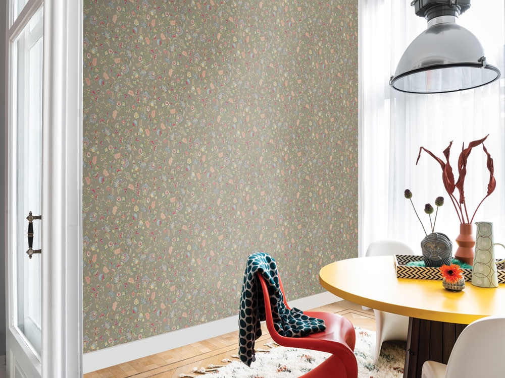 Vliesová, vícebarevná tapeta s vinylovým povrchem s květinovým ornamentálním vzorem.