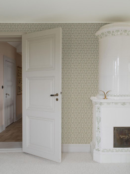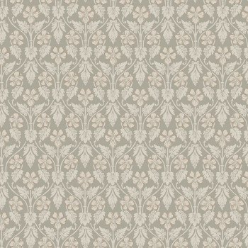 Vliesová tapeta na zeď, šedo-zelený podklad, květinový vzor se secesními prvky - květiny v teplé šedobéžové barvě, zvýrazněné zlatohnědými konturami.