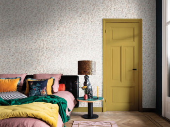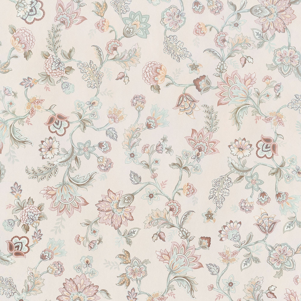 Vliesová, vícebarevná tapeta s vinylovým povrchem s květinovým ornamentálním vzorem.