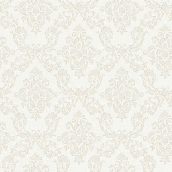 Vliesová tapeta na zeď, zámecký medailonový vzor v odstínech šedo-béžové, obrysy vzoru se zlatými akcenty.
