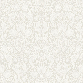 Vliesová tapeta na zeď, ornamentální květinový vzor s tulipány a listy, v neutrálních béžových tónech.