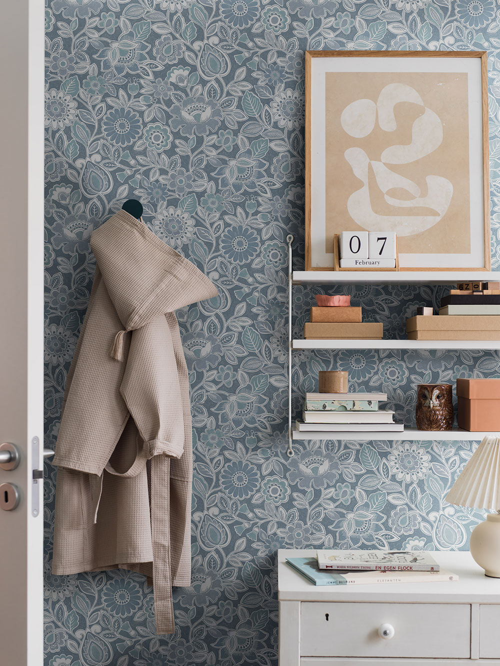 Vliesová tapeta na zeď, květinový vzor s nádechem retra v modrých tónech.