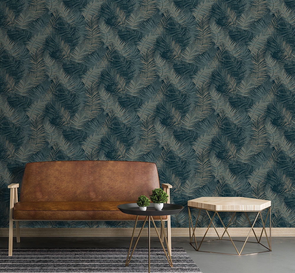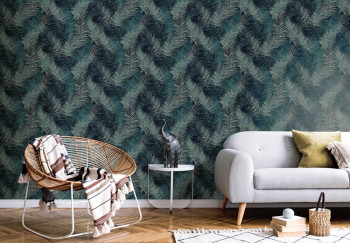 Vliesová tapeta s vinylovým povrchem s palmovými listy v odstínech modré a pololesklé zlato-béžové.