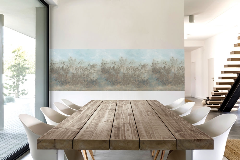 Vliesová, vícebarevná, omyvatelná tapeta s motivy přírody, stromů. tapeta se lepí horizontálně - vzor na šířku.