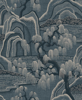 Vliesová tapeta na zeď, motiv zahrady "Indigo Garden" v odstínech tmavé modré a béžové.