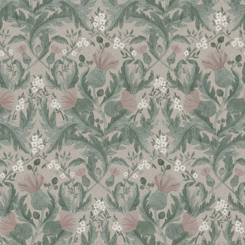 Vliesová tapeta na zeď, šedý podklad, motiv bodláku a drobných květin.