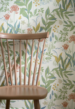 Vliesová tapeta na zeď, bílý podklad, první jarní květiny a šnečci v odstínech zelené, modré, žluté a světlé terakotové.