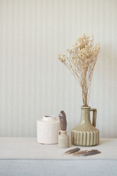 Vliesová tapeta. Jemně plastická struktura, odstíny krémové a šedo-béžové, střídání matu s jemným pololeskem.