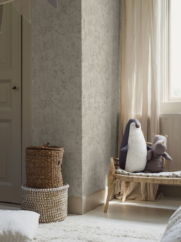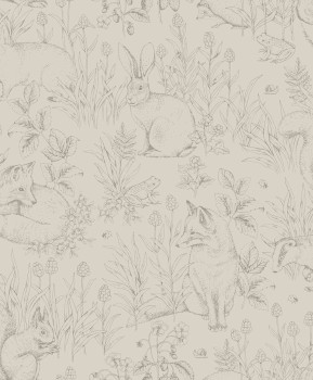 Dětská vliesová tapeta na zeď, šedo-béžový podklad, šedé obrysy lesních zvířátek a rostlin.