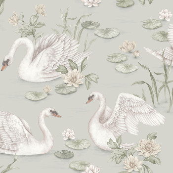 Vliesová tapeta na zeď, šedo-zelený podklad, motivy labutí na jezeře s lekníny, odstíny zelené a béžové.