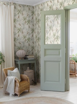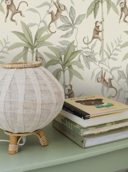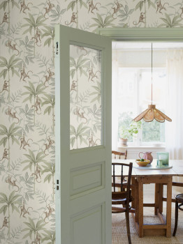 Vliesová tapeta na zeď, bílý podklad, motiv opiček v džungli, odstíny zelené, šedé a hnědé.