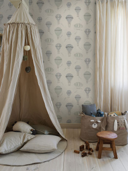 Vliesová tapeta na zeď, létající balony v odstínech šedé, pastelové modré a zelené, proužkový podklad.