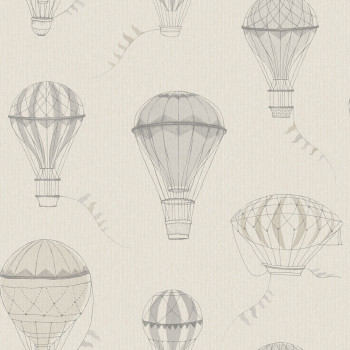 Vliesová tapeta na zeď, létající balony v odstínech šedé a béžové, proužkový podklad.