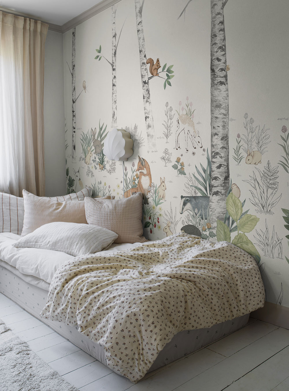 Barevnost je příjemná a uklidňující – jemné zelené, béžové, modré i hnědé tóny vytvářejí harmonickou atmosféru, která podporuje dětskou představivost a zároveň neruší při usínání. Tapety se hodí do dětského pokojíčku, herny i koutku na hraní – a porostou s vaším dítětem.
