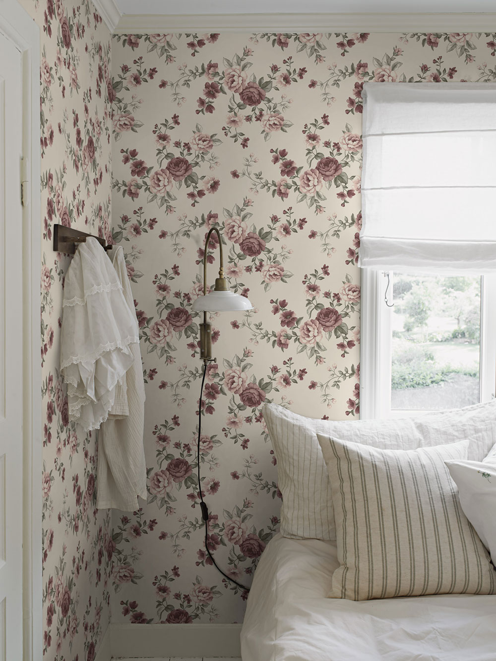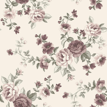 Vliesová tapeta na zeď, krémový podklad, motiv růží v odstínech zelené, vínové červené a růžové.