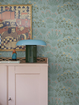 Vliesová tapeta na zeď, modrý podklad, luční květiny v odstínech zelené, růžové a žluté.