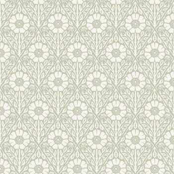 Vliesová tapeta na zeď, tlumený zelený podklad, motiv šípkových růží v kosočtvercovém vzoru.
