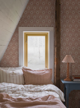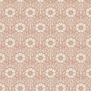 Vliesová tapeta na zeď, terakotově červený podklad, motiv šípkových růží v kosočtvercovém vzoru.