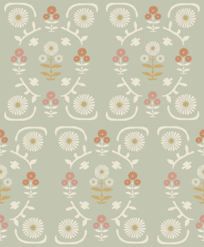 Vliesová tapeta na zeď, podklad tlumená zelená, květinový vzor v odstínech hnědé, růžové a bílé.