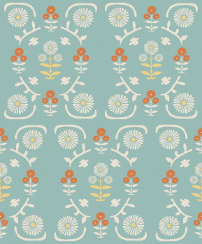 Vliesová tapeta na zeď, podklad modrý, květinový vzor v odstínech cihlově červené a žluté.