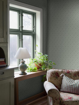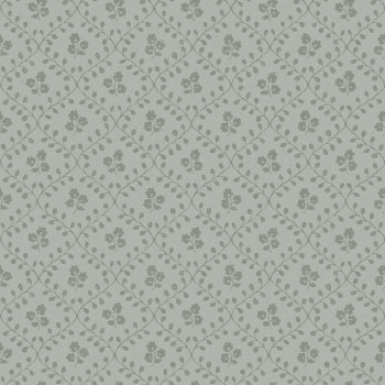Vliesová tapeta na zeď, ornamentální květinový motiv inspirovaný tradičními výšivkami, odstíny zelené a šedo-zelené.