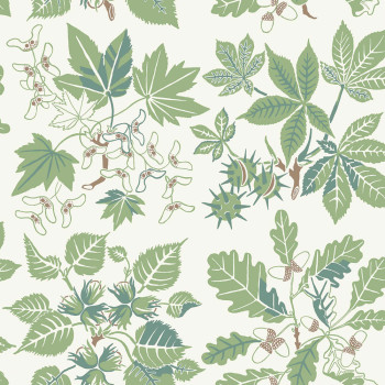 Vliesová tapeta na zeď, smetanově bílý podklad, motiv větviček javoru, lísky, kaštanu a dubu v odstínech zelené a hnědé.