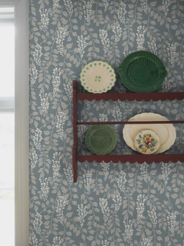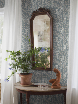 Vliesová tapeta na zeď, modrý podklad, motiv rozkvetlé Vistárie v odstínech šedo-béžové a bílé.