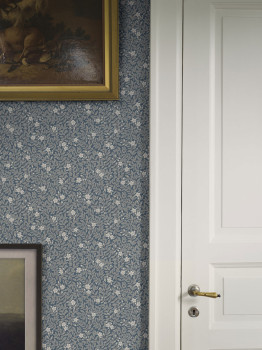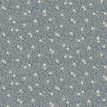 Vliesová tapeta na zeď, modrý podklad, motiv rozkvetlých větviček Myrty v odstínech šedé, bílé, hnědé stonky.