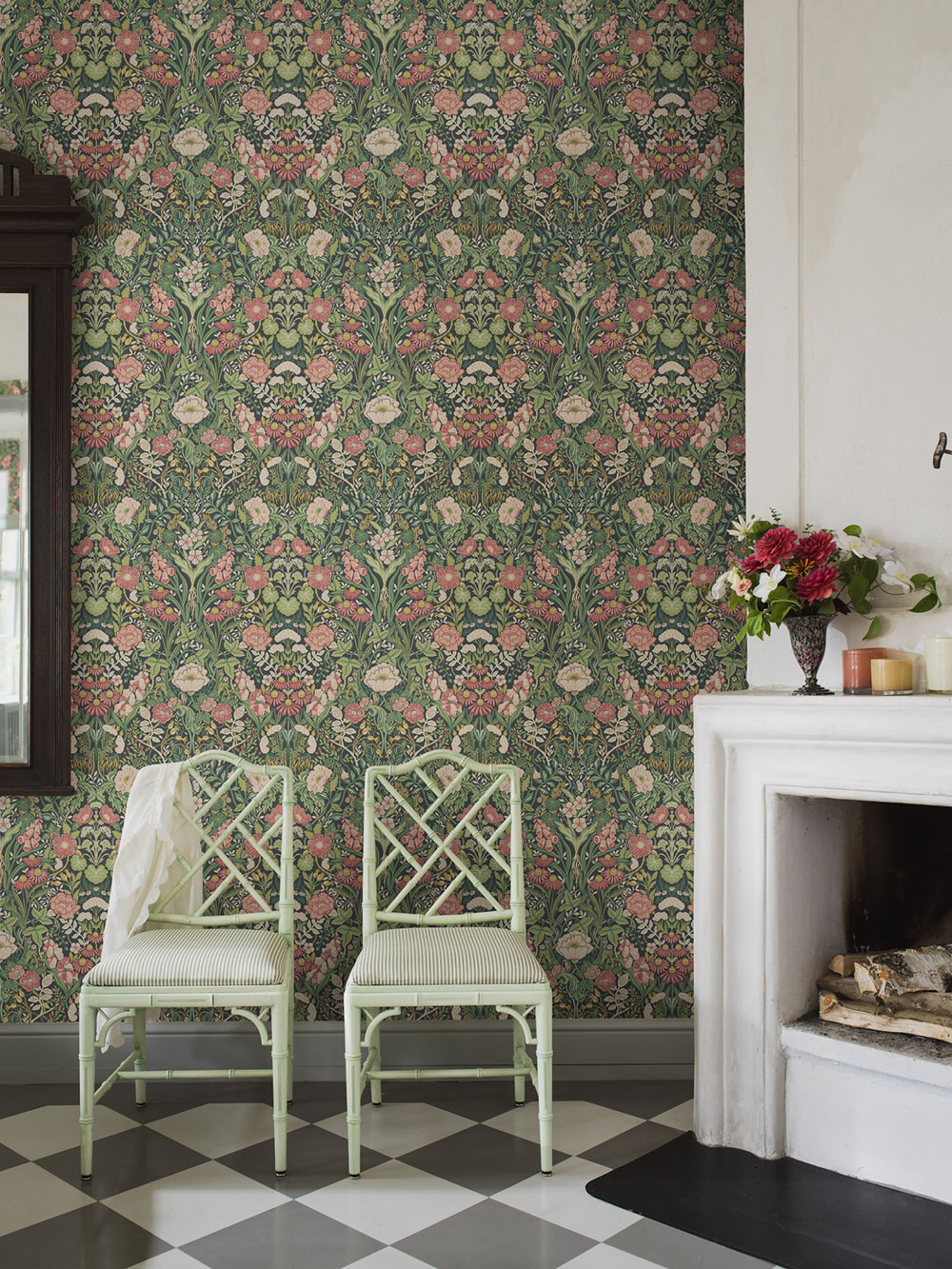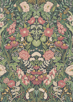 Vliesová tapeta na zeď, černý podklad, bohatý květinový vzor v odstínech zelené, růžové a okrové.