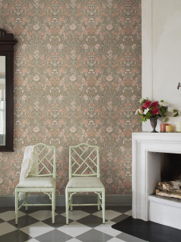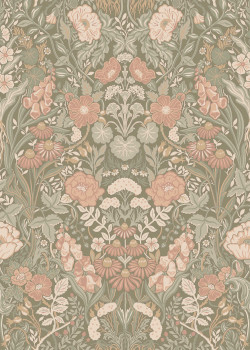 Vliesová tapeta na zeď, khaki podklad, bohatý květinový vzor v odstínech zelené, růžové, béžové a šedé.