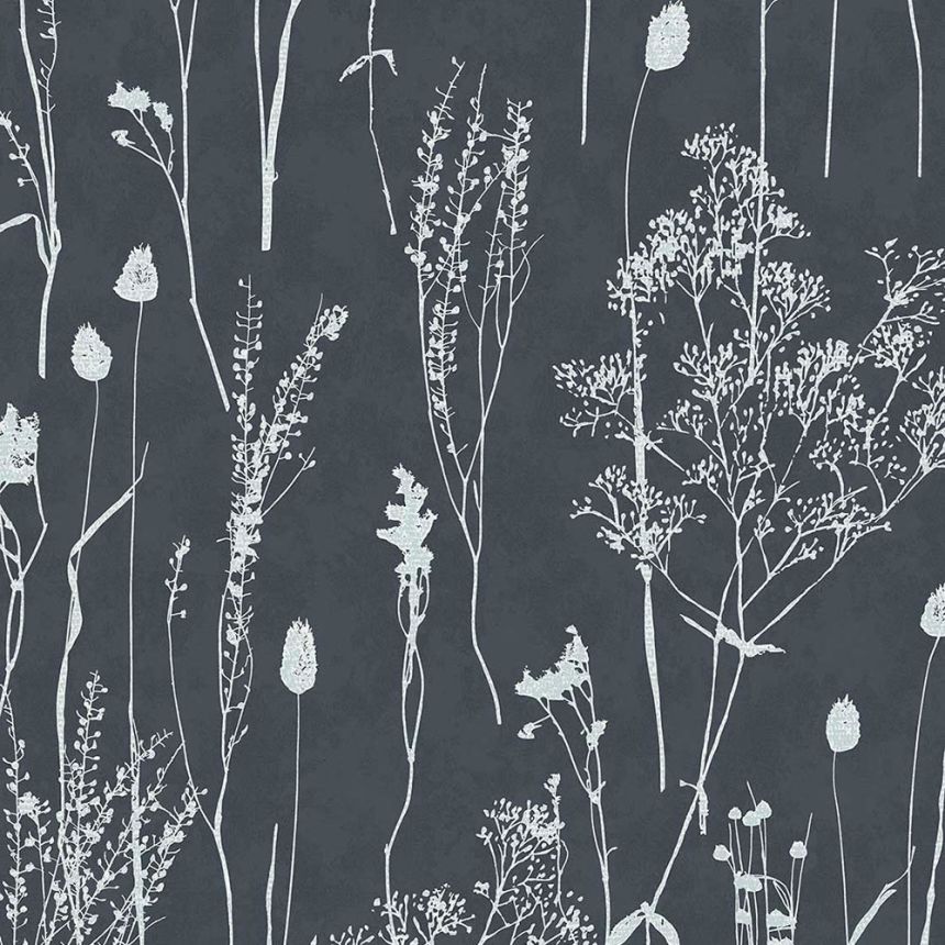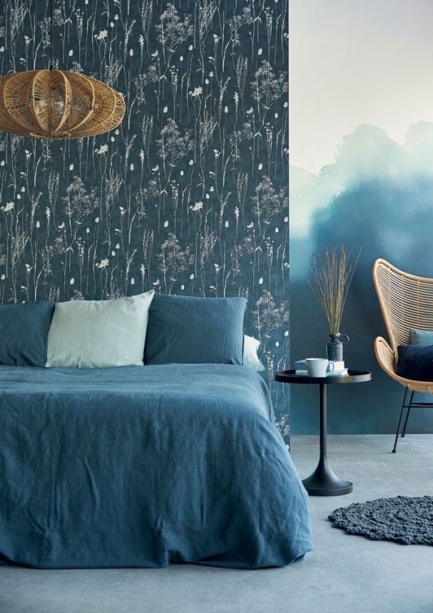 Vliesová tapeta s jemně plastickým povrchem, design lučních rostlin v odstínech bílé/bledě modré, podklad tmavě modrý.